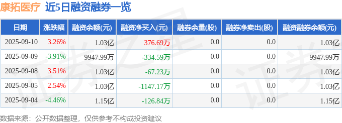 康拓医疗融资融券信息显示,融资方面,当日融资买入1078.8万元,融资偿还702.11万元,融资净买入376.69万元。融券方面,融券卖出0.0股,融券偿还0.0股,融券余量0.0股,融券余额0.0万元。融资融券余额1.03亿元。