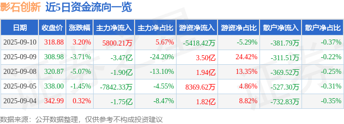 证券之星消息,截至2025年9月10日收盘,影石创新(688775)报收于318.88元,上涨3.2%,换手率10.52%,成交量3.21万手,成交额10.24亿元。