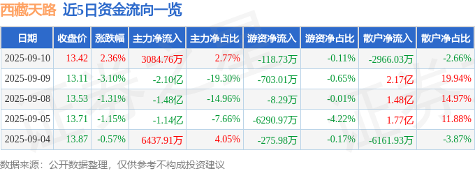 证券之星消息,截至2025年9月10日收盘,西藏天路(600326)报收于13.42元,上涨2.36%,换手率6.23%,成交量83.14万手,成交额11.14亿元。