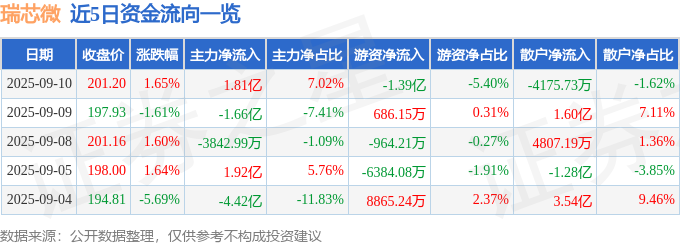 证券之星消息,截至2025年9月10日收盘,瑞芯微(603893)报收于201.2元,上涨1.65%,换手率3.05%,成交量12.82万手,成交额25.78亿元。