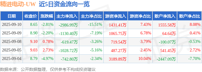 证券之星消息,截至2025年9月10日收盘,精进电动(688280)报收于8.65元,下跌2.81%,换手率4.2%,成交量21.84万手,成交额1.93亿元。
