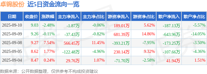 证券之星消息,截至2025年9月10日收盘,卓锦股份(688701)报收于9.03元,下跌2.48%,换手率2.74%,成交量3.68万手,成交额3362.2万元。