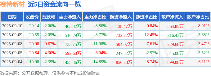 证券之星消息,截至2025年9月10日收盘,赛特新材(688398)报收于20.14元,下跌2.0%,换手率1.34%,成交量2.25万手,成交额4554.12万元。