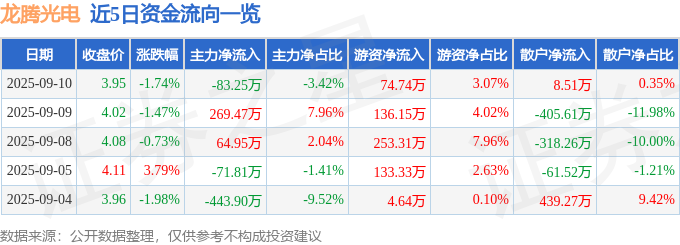 证券之星消息,截至2025年9月10日收盘,龙腾光电(688055)报收于3.95元,下跌1.74%,换手率0.18%,成交量6.09万手,成交额2432.12万元。