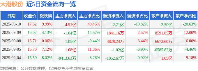 证券之星消息,截至2025年9月10日收盘,大港股份(002077)报收于17.62元,上涨9.99%,涨停,换手率11.14%,成交量64.66万手,成交额11.15亿元。