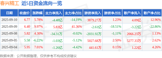 证券之星消息,截至2025年9月10日收盘,春兴精工(002547)报收于6.77元,上涨5.78%,换手率42.43%,成交量468.82万手,成交额31.58亿元。