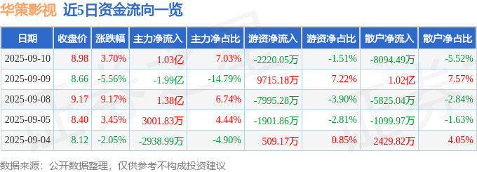 证券之星消息,截至2025年9月10日收盘,华策影视(300133)报收于8.98元,上涨3.7%,换手率10.1%,成交量164.07万手,成交额14.68亿元。