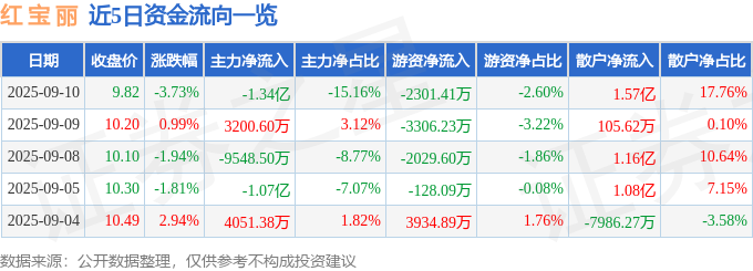 证券之星消息,截至2025年9月10日收盘,红 宝 丽(002165)报收于9.82元,下跌3.73%,换手率12.31%,成交量89.59万手,成交额8.85亿元。