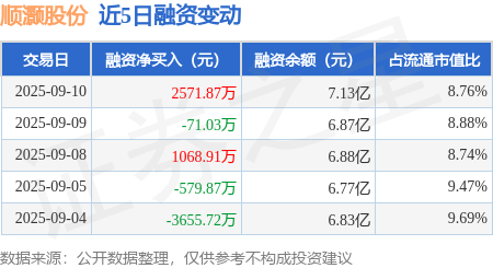 证券之星消息,9月10日,顺灏股份(002565)融资买入5465.2万元,融资偿还2893.33万元,融资净买入2571.87万元,融资余额7.13亿元。