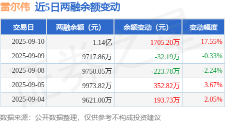 证券之星消息,9月10日,雷尔伟(301016)融资买入5848.1万元,融资偿还4142.9万元,融资净买入1705.2万元,融资余额1.14亿元。