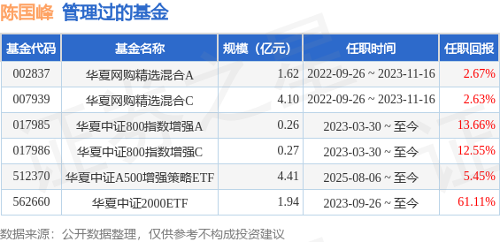 陈国峰先生:硕士,2015年7月至2020年1月,曾任世坤投资咨询有限公司(WorldQuant)中国区研究总监等。2020年加入华夏基金管理有限公司,历任数量投资部研究员、投资经理助理。2022年9月26日至2023年11月16日担任华夏网购精选灵活配置混合型证券投资基金基金经理。2023年9月26日起担任华夏中证2000交易型开放式指数证券投资基金基金经理。