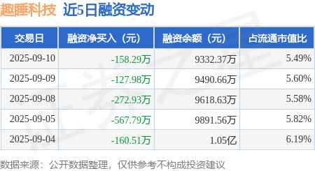 证券之星消息,9月10日,趣睡科技(301336)融资买入476.14万元,融资偿还634.42万元,融资净卖出158.29万元,融资余额9332.37万元。