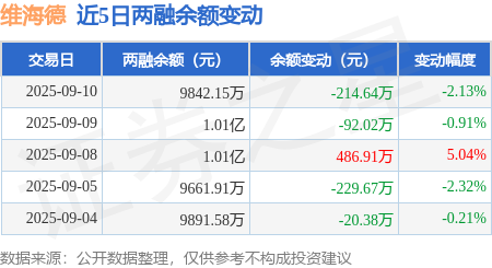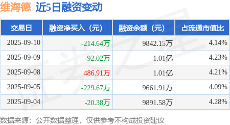 证券之星消息,9月10日,维海德(301318)融资买入404.84万元,融资偿还619.49万元,融资净卖出214.64万元,融资余额9842.15万元。