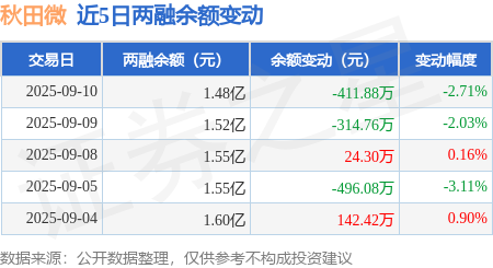 证券之星消息,9月10日,秋田微(300939)融资买入605.24万元,融资偿还1017.12万元,融资净卖出411.88万元,融资余额1.48亿元。