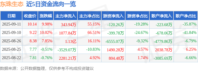 证券之星消息,截至2025年9月11日收盘,东珠生态(603359)报收于10.14元,上涨9.98%,已连续涨停2天,换手率0.14%,成交量6150.0手,成交额623.62万元。