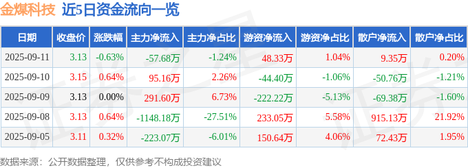 9月11日的资金流向数据方面,主力资金净流出57.68万元,占总成交额1.24%,游资资金净流入48.33万元,占总成交额1.04%,散户资金净流入9.35万元,占总成交额0.2%。