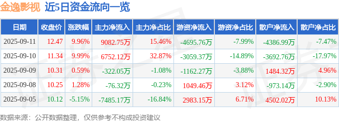 证券之星消息,截至2025年9月11日收盘,金逸影视(002905)报收于12.47元,上涨9.96%,已连续涨停2天,换手率14.43%,成交量50.43万手,成交额5.87亿元。