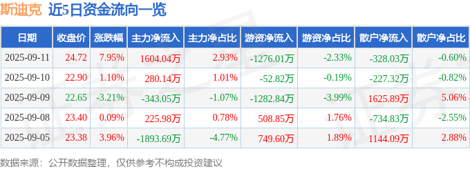 证券之星消息,截至2025年9月11日收盘,斯迪克(300806)报收于24.72元,上涨7.95%,换手率7.2%,成交量22.76万手,成交额5.47亿元。