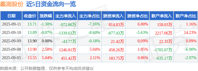 9月11日的资金流向数据方面,主力资金净流出972.86万元,占总成交额7.16%,游资资金净流入814.83万元,占总成交额6.0%,散户资金净流入158.03万元,占总成交额1.16%。
