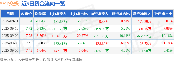 证券之星消息,截至2025年9月11日收盘,*ST交投(002200)报收于7.64元,下跌1.04%,换手率1.52%,成交量2.8万手,成交额2134.24万元。