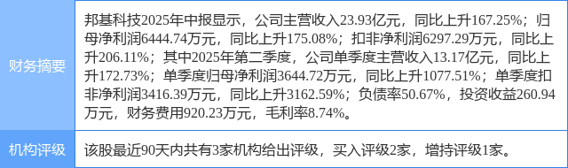 2025年8月1日,华鑫证券研究员娄倩发布了对邦基科技的研报《公司事件点评报告:饲料主业快增逐季兑现,收购打开养殖第二曲线》,该研报对邦基科技给出“买入”评级。研报中预测公司2025-2027年收入分别为43.28、54.17、66.13亿元,EPS分别为0.80、1.42、2.01元,基于饲料业务的持续向好及养殖业务整合的积极前景,维持“买入”评级。证券之星数据中心根据近三年发布的研报数据计算,该研报作者对此股的盈利预测准确度为46.69%。
