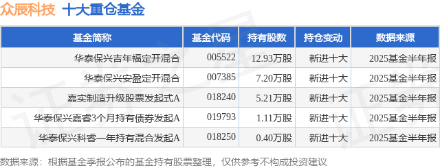 根据2025基金半年报公募基金重仓股数据,重仓该股的公募基金共5家,其中持有数量最多的公募基金为华泰保兴基金的华泰保兴吉年福定开混合。华泰保兴吉年福定开混合目前规模为1.85亿元,最新净值1.4587(9月10日),较上一交易日下跌0.42%,近一年上涨46.94%。该公募基金现任基金经理为田荣。田荣在任的基金产品包括:华泰保兴成长优选A,管理时间为2022年12月30日至今,期间收益率为38.11%;