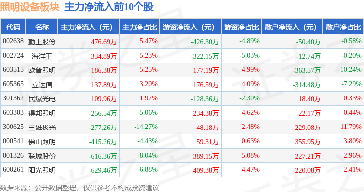 从资金流向上来看,当日照明设备板块主力资金净流出3569.73万元,游资资金净流入2761.92万元,散户资金净流入807.81万元。照明设备板块个股资金流向见下表: