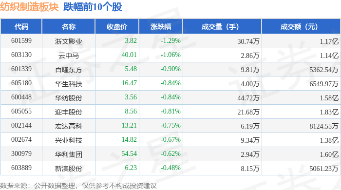 证券之星消息,9月11日纺织制造板块较上一交易日上涨0.28%,南山智尚领涨。当日上证指数报收于3875.31,上涨1.65%。深证成指报收于12979.89,上涨3.36%。纺织制造板块个股涨跌见下表: