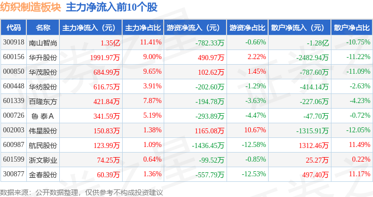 从资金流向上来看,当日纺织制造板块主力资金净流入2915.26万元,游资资金净流入3201.07万元,散户资金净流出6116.33万元。纺织制造板块个股资金流向见下表: