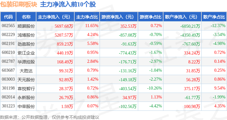 从资金流向上来看,当日包装印刷板块主力资金净流出2.23亿元,游资资金净流出1678.84万元,散户资金净流入2.4亿元。包装印刷板块个股资金流向见下表: