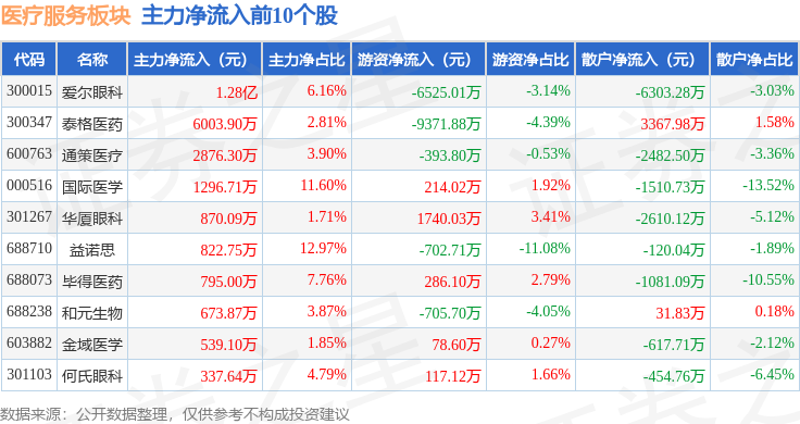 从资金流向上来看,当日医疗服务板块主力资金净流出11.95亿元,游资资金净流入3578.14万元,散户资金净流入11.59亿元。医疗服务板块个股资金流向见下表:
