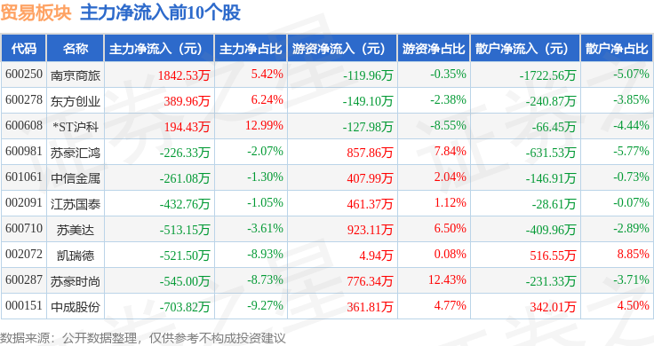 从资金流向上来看,当日贸易板块主力资金净流出1.27亿元,游资资金净流入7866.65万元,散户资金净流入4803.15万元。贸易板块个股资金流向见下表: