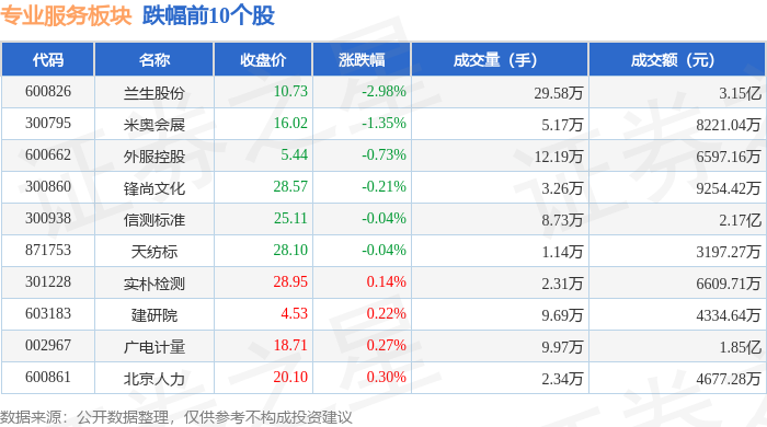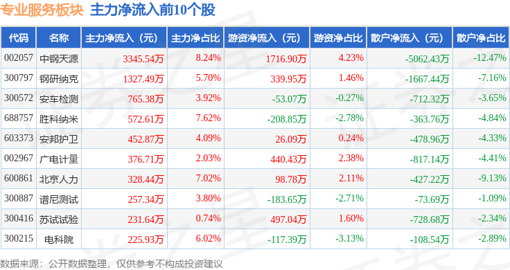 从资金流向上来看,当日专业服务板块主力资金净流出5222.4万元,游资资金净流入3332.52万元,散户资金净流入1889.88万元。专业服务板块个股资金流向见下表: