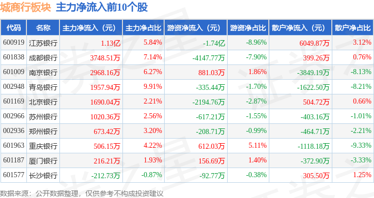 从资金流向上来看,当日城商行板块主力资金净流入9479.46万元,游资资金净流出1.75亿元,散户资金净流入8018.04万元。城商行板块个股资金流向见下表: