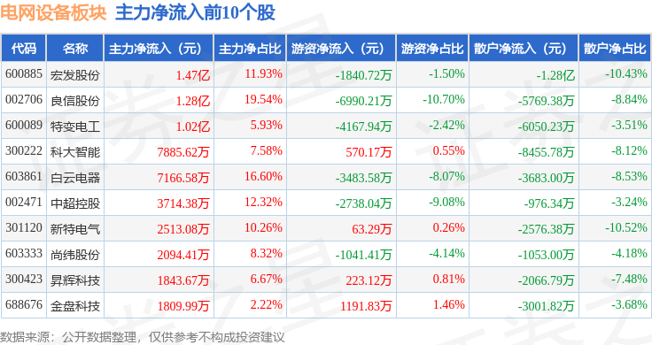 从资金流向上来看,当日电网设备板块主力资金净流出1.27亿元,游资资金净流出5.65亿元,散户资金净流入6.92亿元。电网设备板块个股资金流向见下表: