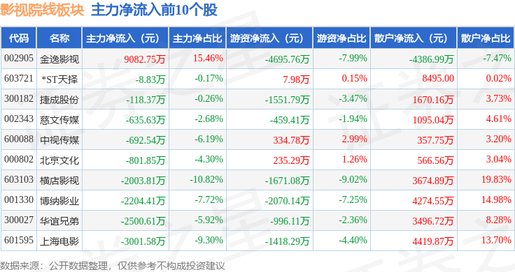 从资金流向上来看,当日影视院线板块主力资金净流出9.46亿元,游资资金净流出1.22亿元,散户资金净流入10.68亿元。影视院线板块个股资金流向见下表: