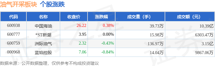 证券之星消息,9月11日油气开采板块较上一交易日上涨0.17%,中国海油领涨。当日上证指数报收于3875.31,上涨1.65%。深证成指报收于12979.89,上涨3.36%。油气开采板块个股涨跌见下表: