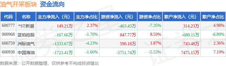 从资金流向上来看,当日油气开采板块主力资金净流出3075.52万元,游资资金净流出4777.23万元,散户资金净流入7852.75万元。油气开采板块个股资金流向见下表: