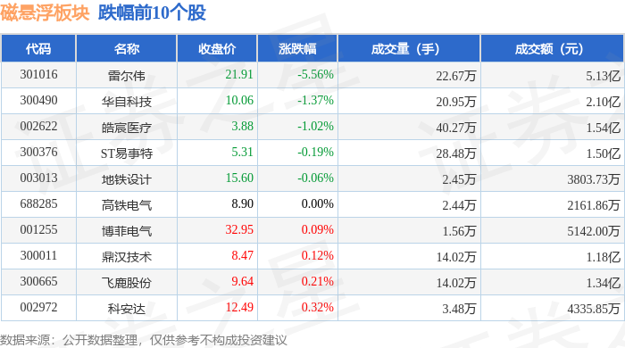 证券之星消息,9月11日磁悬浮板块较上一交易日上涨1.77%,湘电股份领涨。当日上证指数报收于3875.31,上涨1.65%。深证成指报收于12979.89,上涨3.36%。磁悬浮板块个股涨跌见下表:
