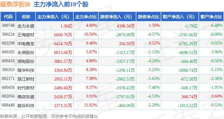 从资金流向上来看,当日磁悬浮板块主力资金净流入1.16亿元,游资资金净流出2.34亿元,散户资金净流入1.18亿元。磁悬浮板块个股资金流向见下表:
