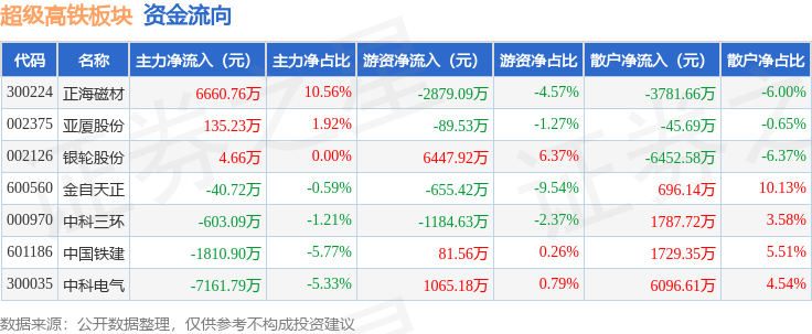 从资金流向上来看,当日超级高铁板块主力资金净流出2815.87万元,游资资金净流入2785.98万元,散户资金净流入29.89万元。超级高铁板块个股资金流向见下表: