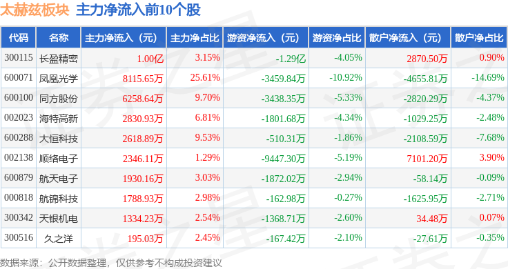 从资金流向上来看,当日太赫兹板块主力资金净流入3116.01万元,游资资金净流出2.1亿元,散户资金净流入1.79亿元。太赫兹板块个股资金流向见下表: