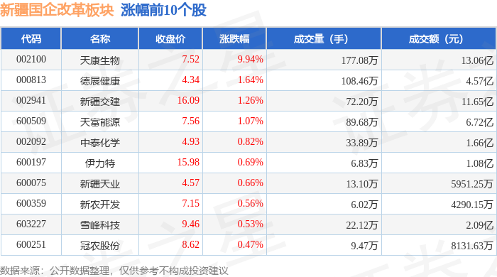 从资金流向上来看,当日新疆国企改革板块主力资金净流出5642.3万元,游资资金净流出8322.64万元,散户资金净流入1.4亿元。新疆国企改革板块个股资金流向见下表: