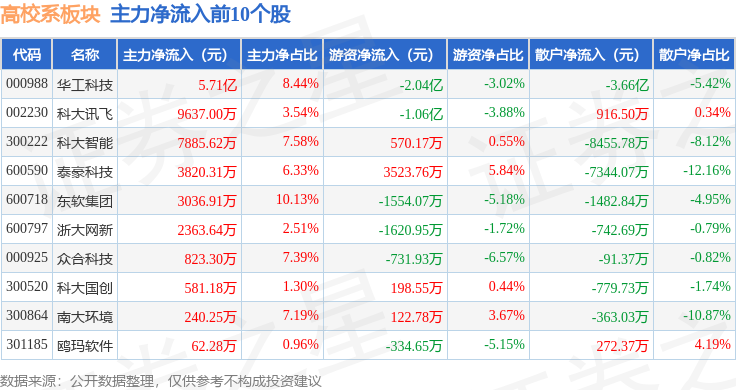 从资金流向上来看,当日高校系板块主力资金净流入7.88亿元,游资资金净流出2.85亿元,散户资金净流出5.03亿元。高校系板块个股资金流向见下表: