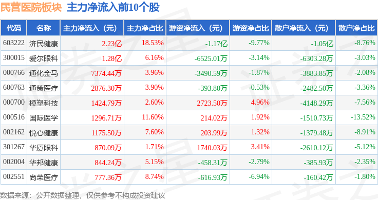 从资金流向上来看,当日民营医院板块主力资金净流出1.26亿元,游资资金净流出1.35亿元,散户资金净流入2.6亿元。民营医院板块个股资金流向见下表:
