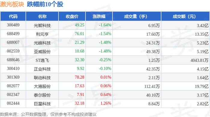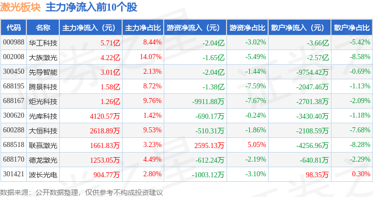 从资金流向上来看,当日激光板块主力资金净流入11.29亿元,游资资金净流出9.65亿元,散户资金净流出1.64亿元。激光板块个股资金流向见下表: