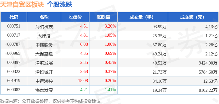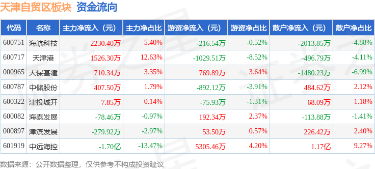 从资金流向上来看,当日天津自贸区板块主力资金净流出1.25亿元,游资资金净流入4107.07万元,散户资金净流入8385.1万元。天津自贸区板块个股资金流向见下表: