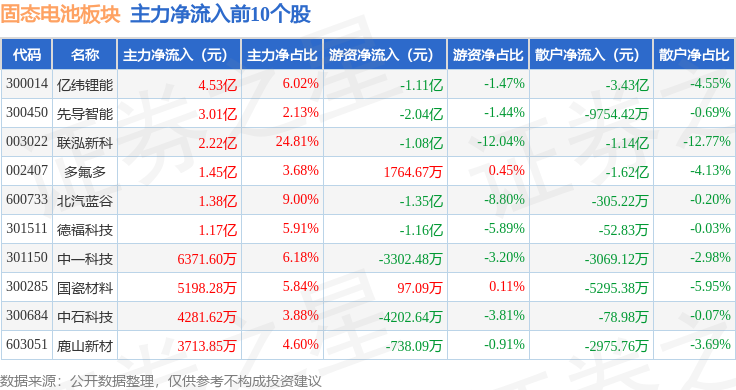 从资金流向上来看,当日固态电池板块主力资金净流出38.16亿元,游资资金净流入4.7亿元,散户资金净流入33.46亿元。固态电池板块个股资金流向见下表: