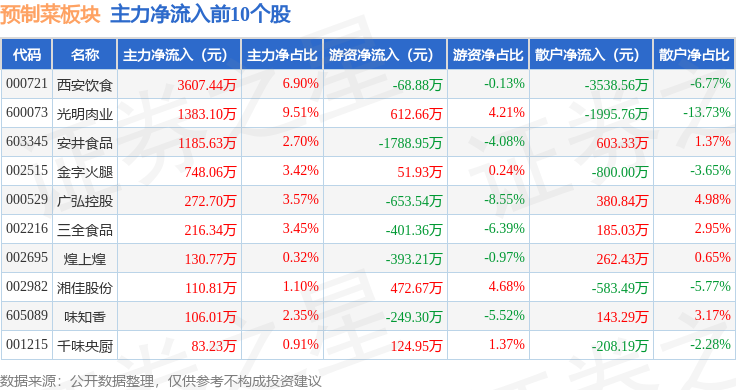 从资金流向上来看,当日预制菜板块主力资金净流出11.45亿元,游资资金净流出6412.85万元,散户资金净流入12.09亿元。预制菜板块个股资金流向见下表: