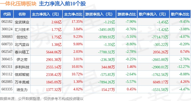 从资金流向上来看,当日一体化压铸板块主力资金净流入4244.03万元,游资资金净流出5.03亿元,散户资金净流入4.6亿元。一体化压铸板块个股资金流向见下表: